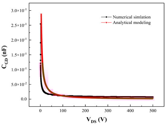 Figure 6 shows the Cgd of the analytical modeling and numerical simulation as the Drain-source voltage (Vds). The Cgd was extracted using a Gaussian distribution and a TCAD simulator for comparative analysis, when the NBPW was 8 × 1017 cm−3. The Cgd of the analytical modeling corresponds to that of the numerical simulation by approximately 86%. The analytical model was able to predict Cgd through the calculation of the BPW charge as the Vds, but all parasitic capacitances of the TMOSFET device were not taken into account for the simple calculation. Thus, when the Vds is less than 100 V, the slight discrepancy between the numerical simulation and analytical model exists, as shown in Figure 6. Although the Cgd was different between the analytical modeling and numerical simulation, analytical modeling was used to estimate the Cgd of the BPW region and predict the switching characteristics due to the effect of BPW.