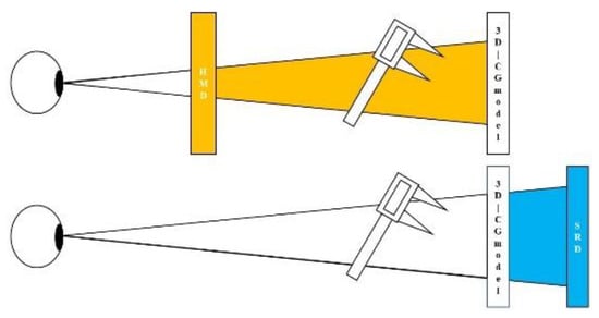The positional relationship between the eyes, 3D-CG model, an augmented reality (AR) device, and objects (e.g., calipers). In the head-mounted display (HMD), the yellow area is in front of the 3D-CG model, and overlapping objects (e.g., calipers) are displayed. For the spatial reality display (SRD), the blue area is behind the 3D-CG model, and it is displayed without overlapping the object (e.g., calipers).