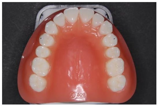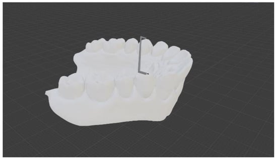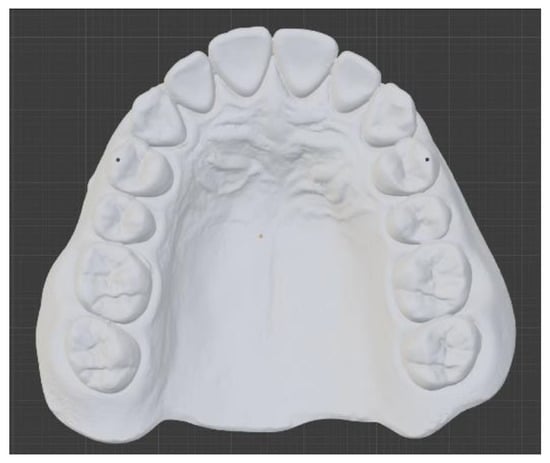 This study used a typodont maxillary dental model (NISSIN, D13-509, Tokyo, Japan) as a control model (Model). The models were scanned using intraoral scanners (iTero element2, Align Technology, San José, CA, USA) to create 3D-CG models. The scan data was exported as STL data and converted to OBJ data in a blender (Blender Foundation, Amsterdam, The Netherlands). Figure 2 shows the Model used, and Figure 3 shows the digital model created.