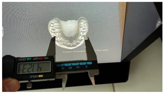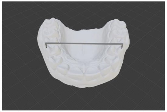 The dental arch width diameter, which is one of the model measurement items in orthodontic clinical practice, was selected as the measurement item. The dental arch width diameter is the distance between the buccal cusps of the left and right first premolars. In clinical practice, it is measured using calipers. Figure 6 shows the orientation of the horizontal model and measurement area, and Figure 7 shows the direction of the depth model and the measurement area.