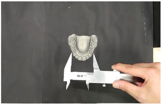 Initially, the participant measured the dental arch width diameter of the Model three times. A digital caliper (SHINWA, 19975, Niigata, Japan) with a self-tolerance error of less than 0.03 mm was used for the measurements. The display of the caliper was hidden from the participant to avoid bias. The same caliper was used for all measurements. All sizes were made to the nearest 0.01 mm.