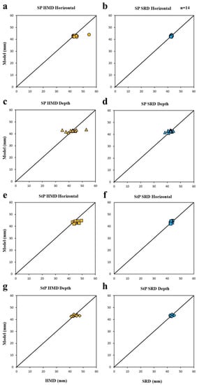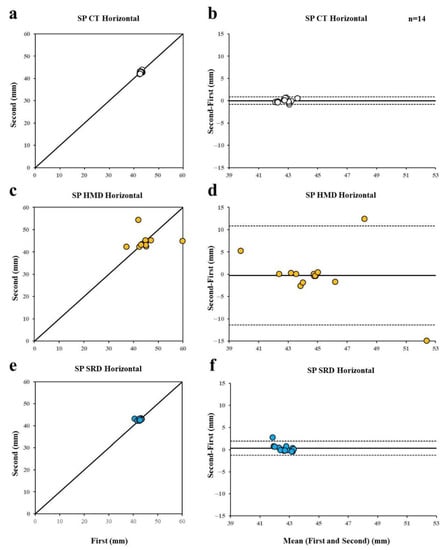 The results of the horizontal measurements in the SP, which were re-measured after 2 weeks, confirmed no reliability issues (ICC > 0.78). From the Bland–Altman analysis, 14 out of 14 raters obtained results within the confidence interval for the Model, 12 out of 14 for HMD, and 13 out of 14 for SRD. Table 2 shows the results of the ICC. Figure 12 shows the results of the Bland–Altman analysis.