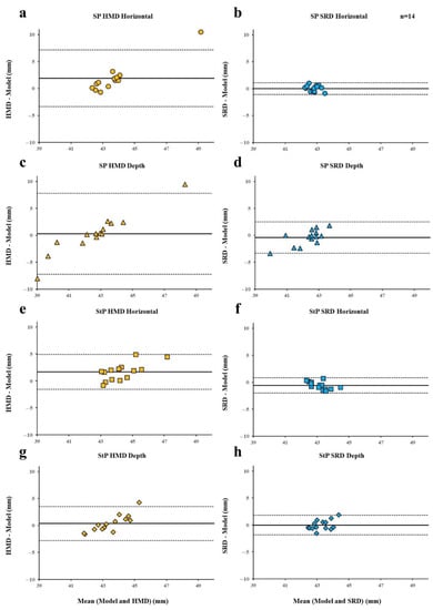 Bland–Altman analysis was used to evaluate the differences between the measurements of the AR device and the control model. Horizontal and SRD measurements in the StP for the HMD were consistent with the Model values for all the items. Figure 13 and Figure 14 show the Bland–Altman analyses.