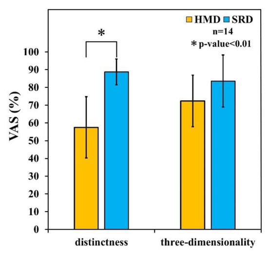 The SRD showed no significant difference across all the measurements; the range of the differences from the Model measurement was −0.58~0.02 mm. The VAS scores showed significant differences in the distinctness of HMDs and SRDs. It has been reported that 3D objects displayed on HMDs can overlap with the actual surgical field and block the view [4]. It is thought that the overlap between the caliper tip and the object caused a variation in the measurements. However, the measured values did not show any correlations between the distinctness and the three dimensions. Problems with convergence distance and focal length have been reported when using HMDs [19], and HMDs at distances closer than 1.0 m can cause visual strain. The positional relationship between the eye, the AR monitor, and the object at a close range has also been reported to cause convergence and adjustment conflicts [20].