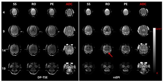 Diffusion images along three directions and calculated ADC maps from two protocols with b = 1000 s/mm2. The forehead distortion caused by EPI readouts and the fat shifting artifacts (red arrow) are shown in rsEPI-based images.