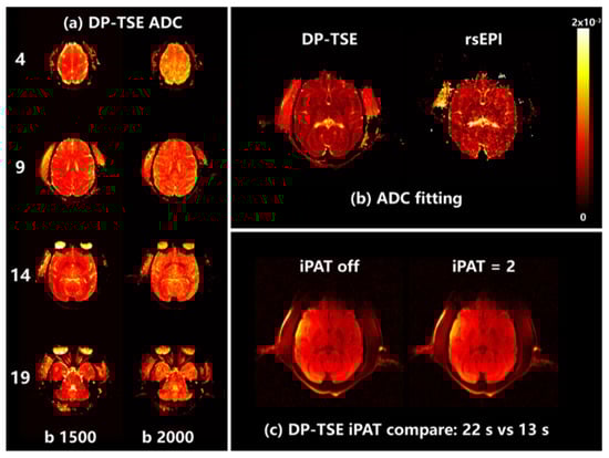 (a) ADC maps from DP-TSE with b = 1500 and 2000 s/mm2. (b) The ADC fitting of two protocols with TR = 1500 ms, b = 100, 300, 600, and 900 s/mm2. (c) Comparison of scan time and image quality with parallel acceleration ON/OFF in DP-TSE, b = 500 s/mm2.