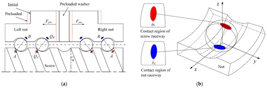 The positioning accuracy of DNBSs is determined by the preload provided by the preloaded washer. When the preload is applied, the working balls in the left nut and right nut are in a fully preloaded state due to the contact deformation of the left nut and right nut, respectively (Figure 1a). The static normal contact force at points A and B is expressed as