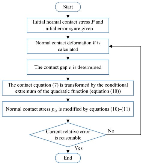 The fast convergence of the contact Equation (11) in the cyclic iteration is achieved by using the conjugate gradient method. The flowchart is shown in Figure 2. The detailed derived process and iteration solution process of the non-Hertzian contact stress is listed as follows [22]:
