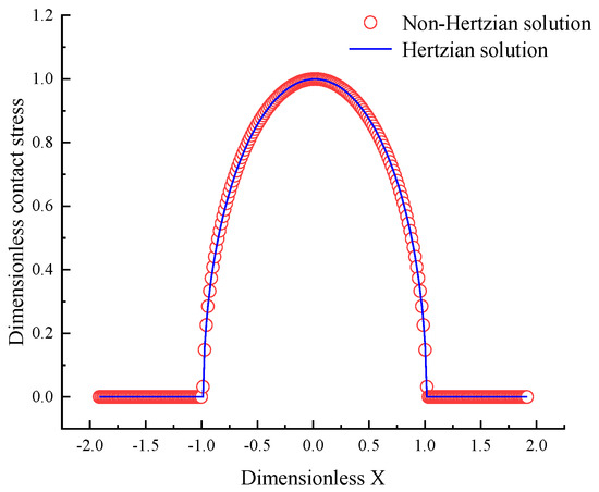 4.1. Comparison of the Normal Contact Stress between Hertzian Solution and Non-Hertzian Solution