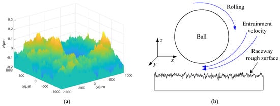 Due to the film contact stress being largely influenced by the surface roughness, the contact surface roughness should be considered in the elastohydrodynamic contact system of BSs. In terms of the mature surface manufacturing technology of the ball, the ball contact surface can be seen as the smooth surface, and the raceway contact surface is the rough fractal surface (Figure 4a).