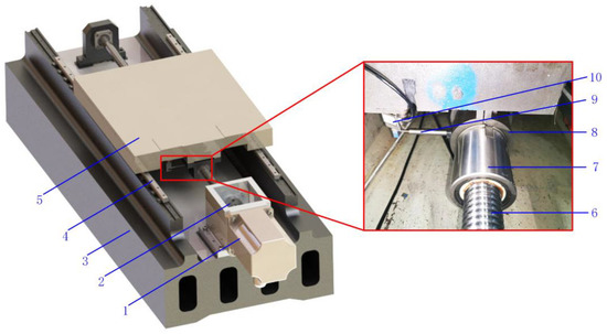 Experimental setup of the DNBSs. 1. Motor. 2. Coupling. 3. Base. 4. Guideway. 5. Table. 6. Screw. 7. Nut. 8. Clamping device. 9. Dowel bar. 10. Tension–compression sensor.