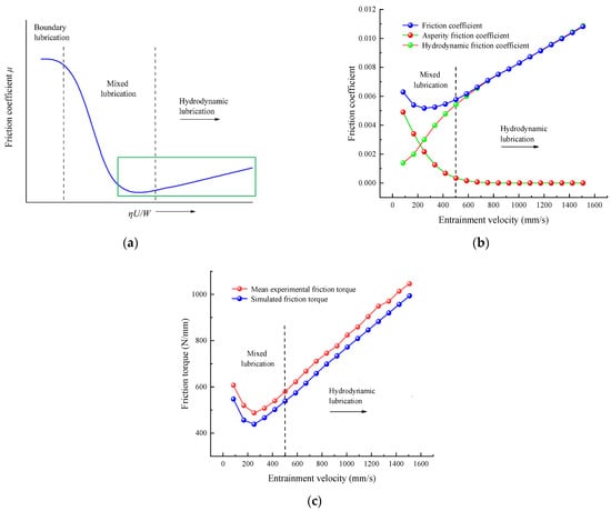 Results of the friction torque test. (a) A schematic Stribeck curve [34]. (b) Friction coefficient curve. (c) Comparison of the simulated and experimental friction torque.