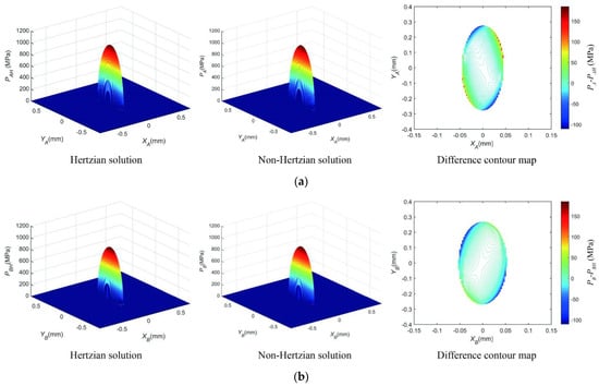 The comparison between the Hertzian solution and non-Hertzian solution of the contact stress under the helix angle is zero is shown in Figure 3. As shown in Figure 3, the non-Hertzian solution is in good agreement with the Hertzian solution in the contact stress calculation results, which is verified the correctness of the non-Hertzian contact stress calculation method.