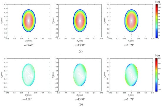 In order to further analyze the effect of contact stress error calculated by the Hertzian contact theory with the variation of the helix angle, the contact stress difference contour maps at the screw raceway contact point A under the helix angle α are 5.68°, 13.97°, and 21.71° are determined, respectively. The elliptical contact region of non-Hertzian solution PA at the contact point A generates a deflection angle θs shown in Figure 8a. The contact stress distribution difference PA-PAH between the non-Hertzian solution PA and the Hertzian solution PAH in the edge of the contact region is largest, and the one in the center of the contact region is smallest shown in Figure 8b.