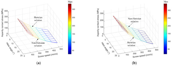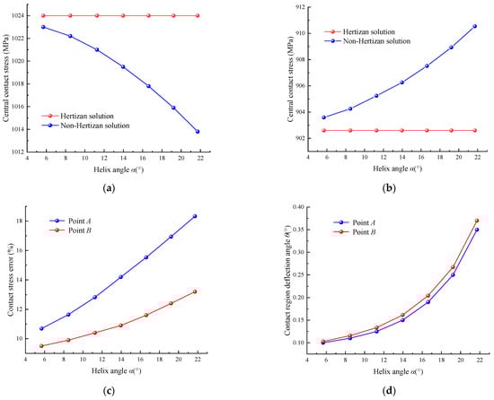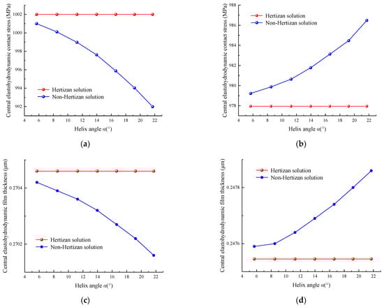 Figure 11a,b show that the variations of central elastohydrodynamic contact stress calculated by the Hertzian solution and non-Hertzian solution with different helix angles, respectively. The variation trends of the central elastohydrodynamic contact stress of point A and point B are the same. However, the values of the central elastohydrodynamic contact stress are greater than that of the central contact stress of point A and point B.