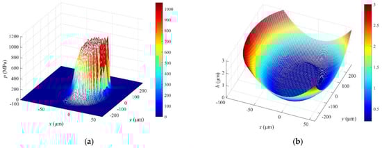 Elastohydrodynamic characteristics using the non-Hertzian contact stress calculation method. (a) Elastohydrodynamic contact stress distribution. (b) Film thickness distribution.