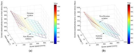 The central elastohydrodynamic contact stresses of the BSs under different helix angles and different screw speeds are shown in Figure 12. As shown in Figure 12a, the non-Hertzian solution is smaller than the Hertzian solution of the central elastohydrodynamic contact stress at contact point A. The central elastohydrodynamic contact stress decreases with the increase in the helix angle and the screw speed, respectively. As shown in Figure 12b, the non-Hertzian solution is greater than the Hertzian solution of the central elastohydrodynamic contact stress at contact point B. The central elastohydrodynamic contact stress increases as the helix angle increases, and decreases as the screw speed increases.