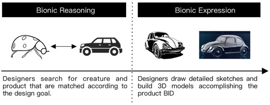 There are two significant processes in product BID: bionic reasoning and bionic expression (Figure 1). In bionic reasoning, designers search for creatures and products that are matched according to the design goal [5,6]. In bionic expressions, designers use the creature and product obtained by reasoning to draw detailed sketches and build 3D models accomplishing the product BID [7].