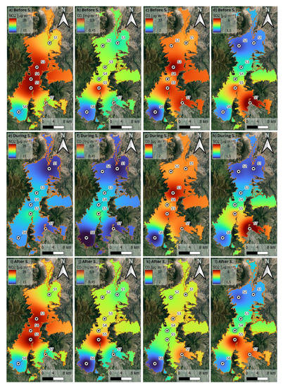 Finally, for concentrations of SO2, during the strike (−7.2 ± 7.48%) and post-strike (+3.29 ± 13.56%), the change is much smaller, with sustained peaks in the southern valley of the city, where a thermoelectric plant is located (Figure 2d,h,l). This indicates there were close to no changes in power generation during the strike. However, further away from the power plant, an impact of reduced city traffic circulation can be observed in almost all the sites during the strike.