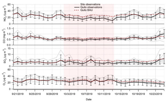 Concentrations of trace gases (NO2, SO2, CO and O3) in Quito averaged (black solid line) over seven monitoring sites (grey shadow) during 12-day periods of pre-strike (20 September 2019–1 October 2019), during the strike (2 October 2019–13 October 2019) and post-strike (14 October 2019–25 October 2019). The red dotted line shows machine learning modeled business-as-usual (BAU) conditions for the city. Error bars show one standard deviation of the observed data.