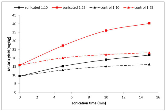 Impact of the sonication time and the solid–liquid ratio (m/V) on the efficiency of MGDGs extraction from rosehip pomace with ethanol.