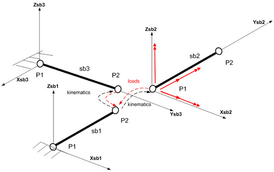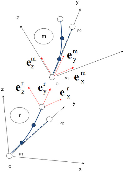 A local coordinate system is attached to the start point (P1) of every sub-body. Local elastic deformations resulting from the beam dynamic equations are defined with respect to this system. This local frame of every sub-body k is subjected to 3 translations and 3 rotations , which include rigid body motion undergone by the sub-body and elastic motions induced by other sub-bodies connected to them. For the th body, let denote a set of (rigid body) displacements and rotations (time variant or invariant) that define the origin and orientation of the local system of the th body in the undeflected state. Rigid body translations will place the component at , while rigid body rotations lead to its rotation matrix . Based on the above, the (global) position vector of any arbitrary point P over the deflected th body with respect to the global inertial frame is expressed through the (local) position vector of P in the undeflected state and the vector of the local elastic deflections (displacements and rotations) (both defined in sub-body local co-ordinates) and the rigid body motion as follows: