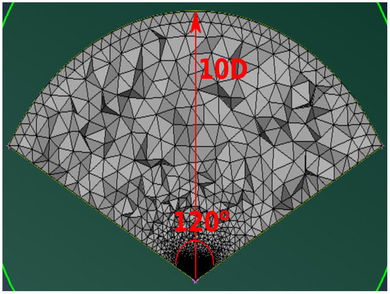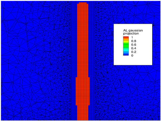The AL numerical parameters regarding the WT simulations have been tested on an axial case at a 11-m/s uniform wind speed. The blades are evenly distributed and considered to be rigid. Structural deflections alongside prebend, cone, and tilt angle of the blades are neglected, so that the configuration is as simple as possible for this parametric study. As a result, we end up with a purely axisymmetric case. In order to reduce computational cost, only one blade has been resolved in the rotating frame, with the use of periodic boundaries and in steady-state condition. The domain is a cylindrical section of 20 rotor diameters () length (see Figure 3) and radius (see Figure 4). Structured and uniform meshing under maximum grid resolution is applied in a thin region surrounding the actuator line. The structured area extends adequately around the actuator line, so that maximum accuracy is acquired in resolving the Gaussian projection of loads (see Figure 5). The characteristic length of this region is denoted by . Moreover, an unstructured and slightly coarser region is considered in order to take into account the near wake impact on the aerodynamic forces. This area extends up to upstream, downstream, and radially from the actuator line, so that the wake expansion is regarded properly. The characteristic length of this region is denoted by .