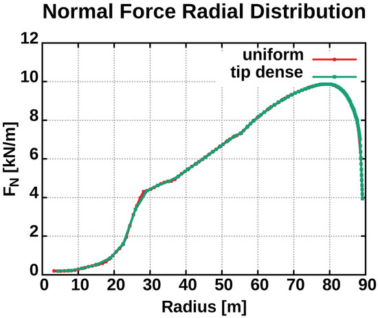 The outcome of the investigation of the effect of the number of strips () (AL control points are located at the center of each strip) and their distribution pattern in the power output is shown in Table 2 and Figure 7 and Figure 8. As a first step, the AL control points are uniformly distributed along the blade, thus leading to a constant strip length (). The parameter is not independently studied, except through the correlation of with . In Table 2, it is clear that is a reasonable rule of thumb to define . Nevertheless, since adds no significant computational cost, the ratio will be used in the following WT aeroelastic simulations, in order to ensure a smooth representation of the radial distribution of aerodynamic forces. Figure 7 and Figure 8 present a comparison between a uniform distribution of control points () with a non-uniform one with the same number of points. Non-uniformity implies a coarse discretization close to the root that gradually gets finer as we approach the tip. As seen in Figure 7 and Figure 8, where the normal and tangential force along the blade span are plotted for the two different discretizations, the two distributions almost coincide due to the large number of points used. Uniform distribution better resolves the loads at the radius of ≈30 m where a local peak appears in particular in the tangential force. No advantage is observed at the tip region when employing denser distribution of points. It is easy to understand that due to the large number of control points along the blade span, a non-uniform distribution adds no extra benefit. Consequently, constant strip length is adopted for the sake of simplicity.