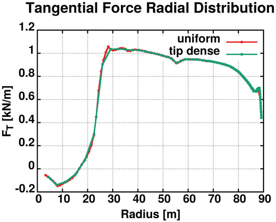 Tangential force radial distribution. Comparison of uniform and tip dense distribution of strips.