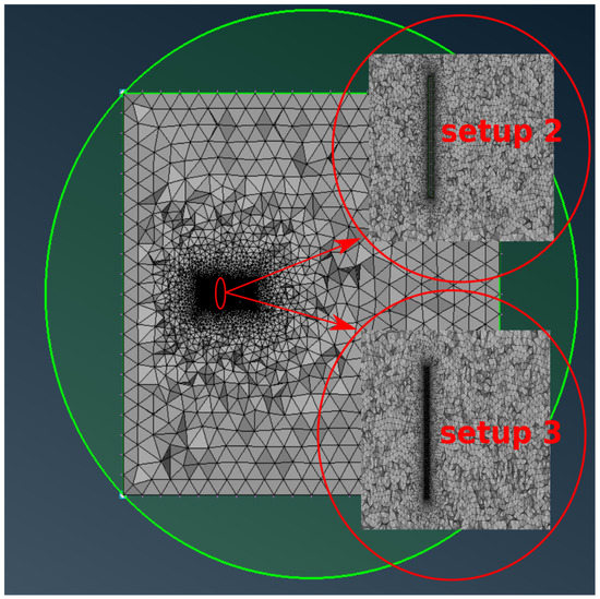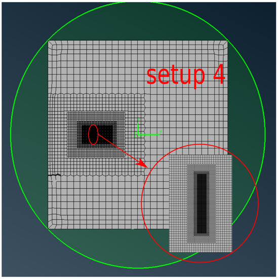 Another crucial aspect is the grid type employed. Fully unstructured, structured, and hybrid grids can be used. Structured grids are orthogonal but with high aspect ratio cells. On the other hand, unstructured grids result in a good aspect ratio, but orthogonality is lost. The projection method used in the AL approach can be sensitive to the type of grid. For this reason, mesh structure needs to be properly examined. In Figure 9, Figure 10 and Figure 11, four different grid setups are visualized, whereas in Table 5 the total number of grid cells and the power outcome of each setup are listed. In Figure 9 a fully structured grid (“setup1”) is shown with 8.9 million cells. The area nearby the rotor is kept uniform and fine with a characteristic length of , followed by a gradual coarsening up to at the limits of the near wake region and a steeper one up to the outer boundaries of the mesh. Figure 10 illustrates two meshing strategies similar to the one used in the periodic, steady-state simulations. Particularly, in “setup2” a fine and structured area is considered around the blade with length , while the rest of the domain is unstructured. Again the near wake region has a characteristic length of and the total amount of grid cells is 2.9 million. The only difference in “setup3” is that the AL vicinity is unstructured, thus exploding the number of cells to 6.2 million. Finally, a hexahedral mesh (“setup4”) is shown in Figure 11 with a total number of 1.9 million cells. The characteristic lengths of close to the rotor and in the near wake region have been maintained in this setup. Based on Table 5, all 4 mesh setups produce similar results. “setup3” shows the greatest discrepancy due to the reduced accuracy in the AL region provoked by the unstructured meshing. “setup4” was preferred due to its minimum number of grid cells.