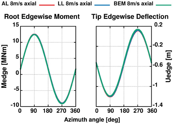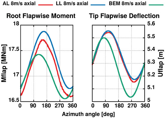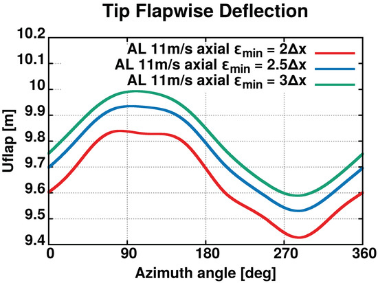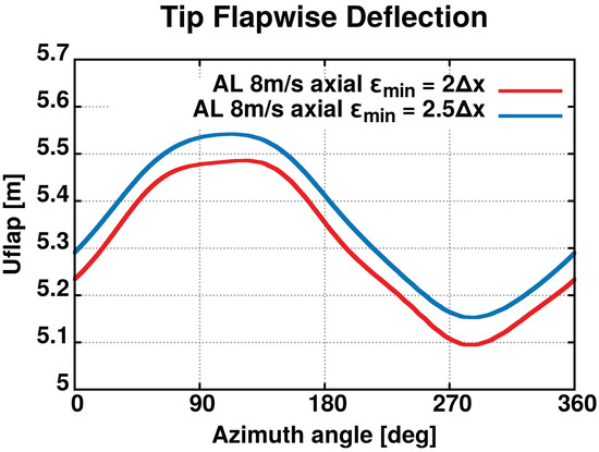 In order to verify the choice of the aerodynamic numerical parameters in an aeroelastic context, coupled aeroelastic simulations are performed under axial wind speed at 8 and 11 m/s. In these cases the prebend, cone, and tilt angle of the blades are accounted for. It is revealed that by choosing , and higher artifact harmonic frequencies are excited. As a result, the signals of loads and deflections, except form the dominant variation are contaminated by significant higher harmonic frequency components. The variation is brought about by the 5 tilt angle of the rotor. As presented in Figure 12 and Figure 13, increasing has a damping effect on the artifact harmonics, since the AL sources get spread in a wider region. In this way, the amplitude of artifact harmonics becomes significantly decreased. The larger the wind speed, the greater the needed increase of , so we end up with at m/s and at 11 m/s. The induced increase in the mean value of the deflection is and respectively with respect to .