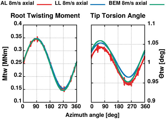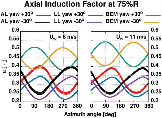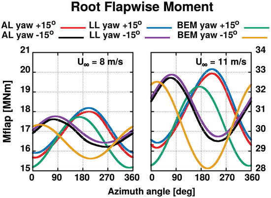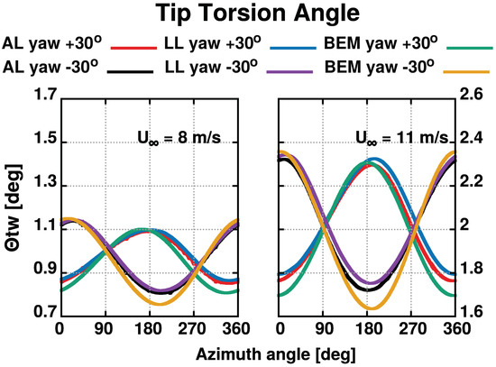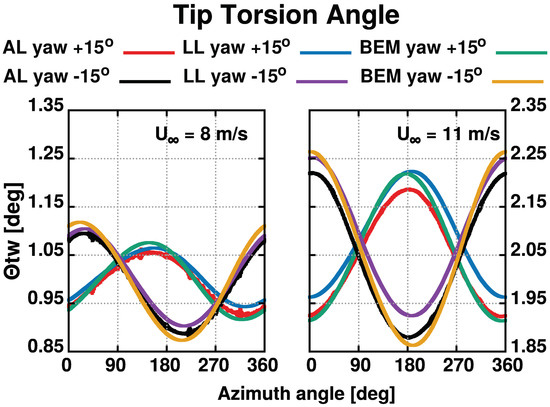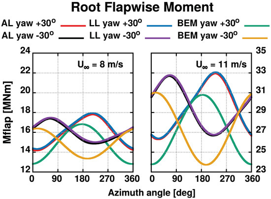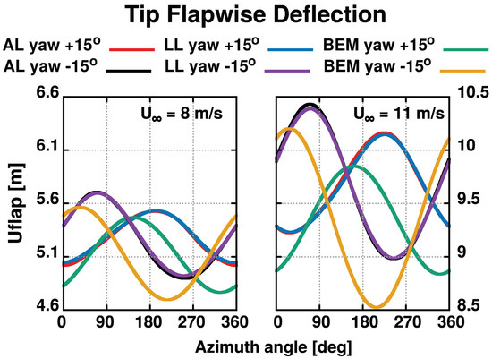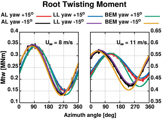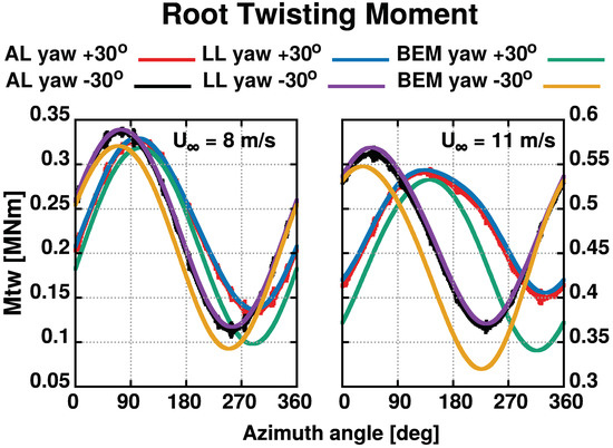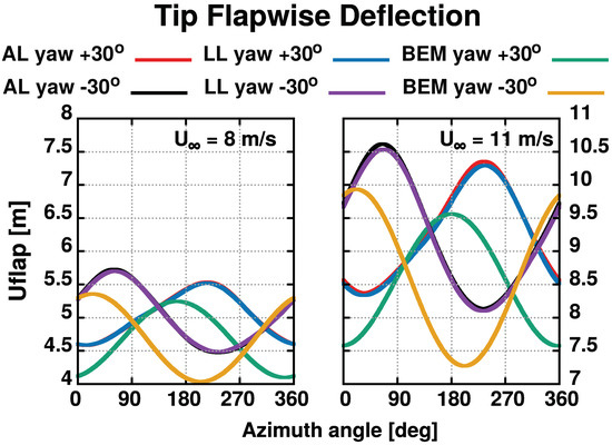 More specifically, in the WT cases, the rotor of the conceptual DTU 10 MW reference wind turbine [28] is modeled. Uniform free-stream flow conditions are simulated for wind speeds of 8 and 11 m/s. Yaw misalignment conditions are considered as well, where free-stream flow angle ranges from −30 to +30. Constant rotational speed and blade pitch angle is assumed for all WT cases. Blade loads and elastic displacements results are depicted as azimuthal variations and radial distributions along the blade span. Comparisons are made between a standard BEM model and the classical LL approach under the framework of free vortex wake modeling [31]. WT analyses are usually based on BEM models, as they are fast and reliable in simple flow cases. Therefore, they have been widely employed in design and analysis. For this reason, BEM results are regarded as reference data in WT simulations of this work. When analyzing complex aerodynamic conditions (yaw misalignment or high shear of the atmospheric boundary layer), the LL model consists of a more accurate alternative due to the detailed vortex particle representation of the wake and the inclusion of viscous corrections on blade loads through dynamic stall models. Consequently, LL results will be used as an extra reference in complex free-stream flow conditions, where AL and BEM results are expected to deviate.