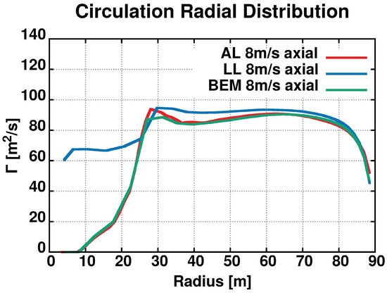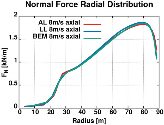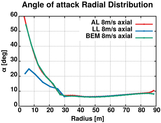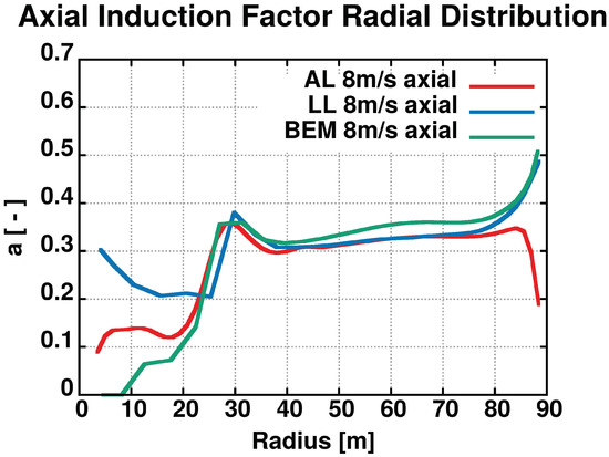 The main shortcoming of the method is that numerous numerical parameters are involved that affect load predictions. In particular, the method used in the projection of the blade forces onto the CFD grid plays an important role in the intensity of the produced tip and root vortices [12]. As a result, in order to capture the blade loads in detail, a case specific tuning is needed for these parameters. A great deal of research effort has been devoted to determining the best practices of body force projection [13,14,15,16]. A common requirement for the successful application of all these methods is the adoption of really fine grid resolution around the blades and in particular close to the blades tip. The alternative is to use a coarse mesh and account for the tip vortex effect through proper tip loss correction models [17,18]. In most of the above cited studies, AL results are compared against results produced by a Lifting Line (LL) model [19] or a Blade Element Momentum (BEM) model that uses Prandtl’s tip correction [20]. Nevertheless, capturing blade loads in detail is still considered to be an issue under investigation for AL methodologies, which requires further development.