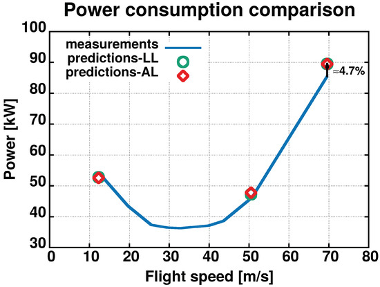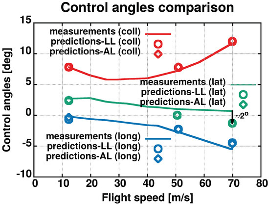 For the helicopter rotor simulations, a scaled model of BO105 MR used in HeliNOVI wind tunnel tests is modeled. In this case, AL predictions are validated against LL simulation results and wind tunnel measurements of the HeliNOVI experiment [32]. Forward flight conditions are tested at low (12.3 m/s), medium (50.5 & 50.9 m/s), and high (69.6 & 69.9 m/s) flight speed conditions. Table A2, Table A3, Table A4 and Table A5 in Appendix A summarize the operational and trim data for these cases. Pitch and Roll attitudes are Euler angles defined in and respectively, whereas Pitch and Roll moments are defined in and (see Figure A2).