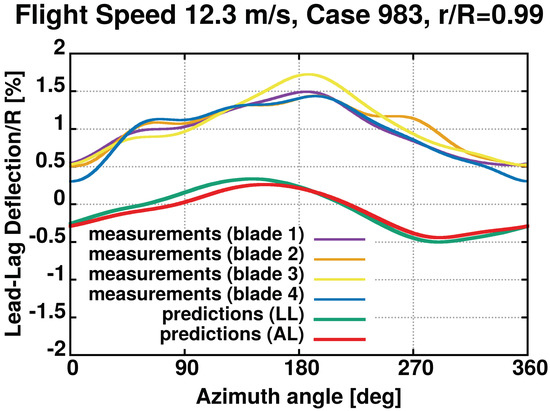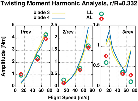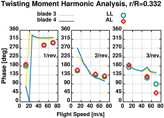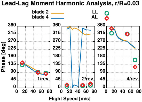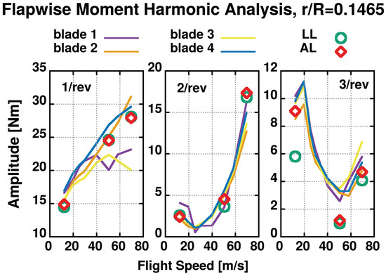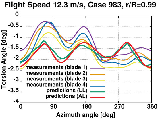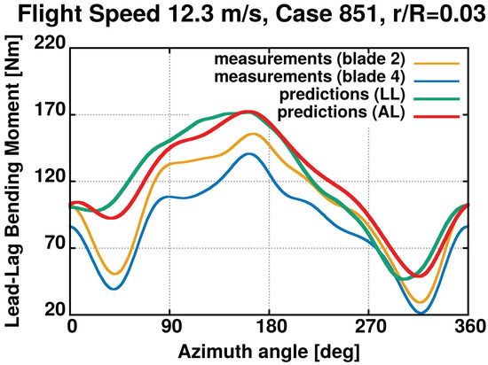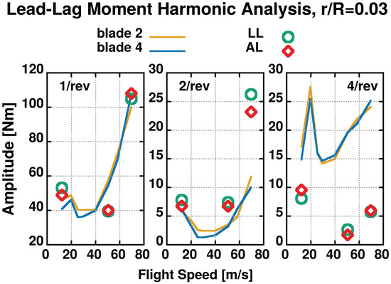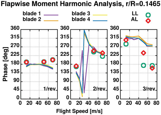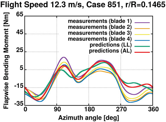 As for the helicopter simulations, a scaled model of BO105 MR is simulated, for which wind tunnel measurements of loads and deflections are available. In this case, AL and LL predictions will be compared against HeliNOVI wind tunnel measured data [32]. Only forward flight conditions are tested at low (12.3 m/s), medium (50.5 & 50.9 m/s), and high (69.6 & 69.9 m/s) flight conditions. Azimuthal variation of loads and deflections and load harmonics (in terms of amplitude and phase) are compared to measured data.