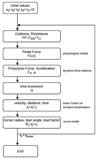 The sequence of computational steps is outlined in Figure 1. Starting from a standstill, with initial values , , , , the resulting drag forces and can be determined using Equations (7) and (8). The cadence results from Equation (10). With these status variables known, the pedal force applied by the athlete is returned from the physiological model and the propulsive force at this position is estimated using Equation (16). The momentary acceleration of the system can now be calculated from the force balance in Equation (6). The time increment elapsed for moving one increment is computed by solving the differential equation of motion for the time interval t, taking into account that due to the lean angle, the centre of gravity travels a distance shorter than :