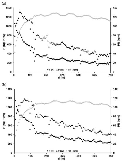 Mean pedal force , pedalling rate and power output P during two 750 m time trials. (a) First run at the development of 7.56 m per pedal revolution, (b) second run at the development of 8.7 m.