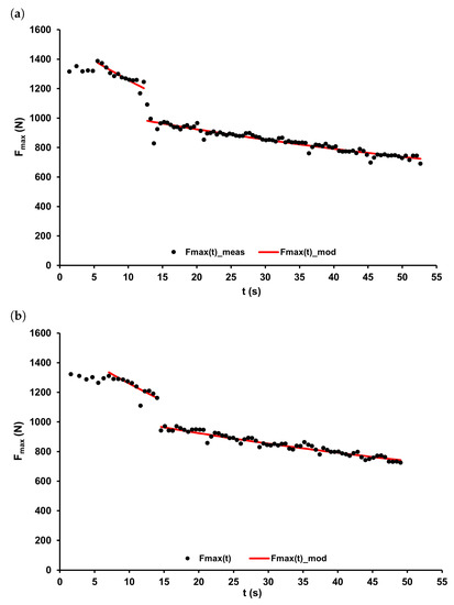 Time-dependent maximal mean pedal force with model function (prediction) calculated by Equation (5) for (a) the first and (b) the second run. The physiological model parameters were fitted to the data of the first run.