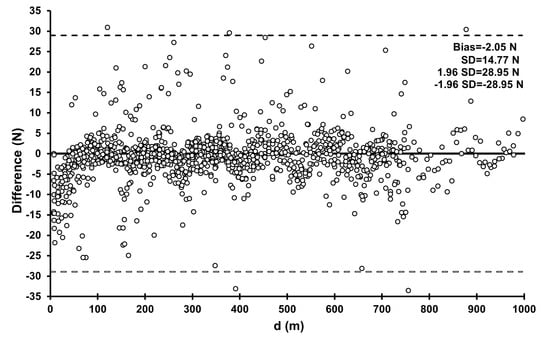 Dispersion between the measured and modelled pedal force as a function of the distance travelled for all runs measured. Black lines indicate upper and lower limits of the 95%-confidence interval.