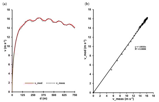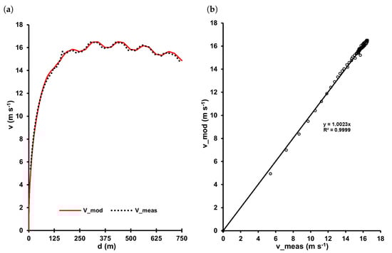 Comparison of measured and modelled velocity in the first run of a 750 m-time trial. (a) Measured and modelled data, (b) linear regression analysis.