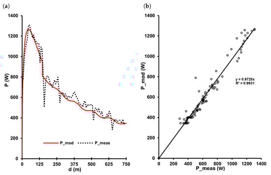 Comparison of measured and modelled mechanical power output in the first run of a 750 m-time trial. (a) Measured and modelled data (b) linear regression analysis.