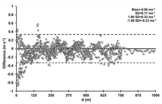 Dispersion of the modelled from measured velocity vs. the distance travelled for both runs of all six athletes. Black lines indicate upper and lower limits of the 95%-confidence interval.
