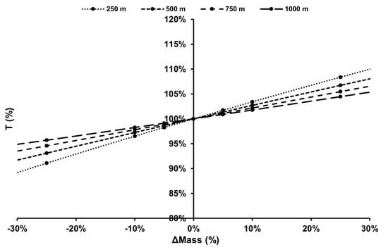 Change in the calculated run-time T of the generic athlete as a function of change in system mass m for distances from 250 to 1000 m.