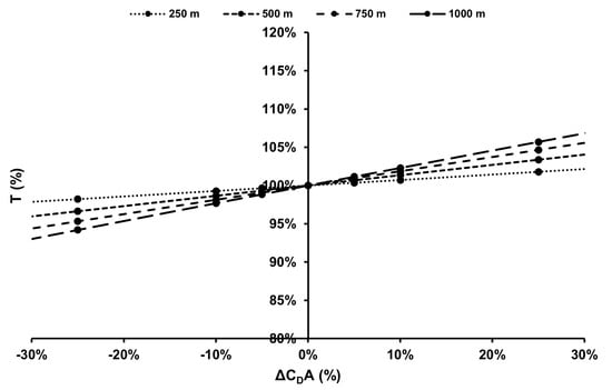 In Figure 10, the effect of a change in aerodynamic drag area on run-time is shown for four different distances. This result is particularly useful as it helps to translate an improvement found by wind-tunnel measurements into run-time savings on the track. In contrast to the effect of a change in mass, the importance of a change in aerodynamic drag increases with increasing run distance, as is apparent by the slope of the curves becoming steeper. As aerodynamic resistance is proportional to v, its impact increases at higher speeds and accumulates over time.