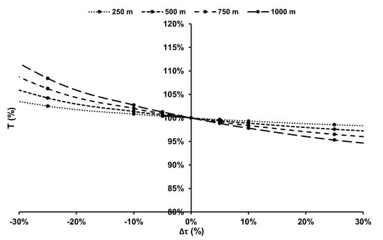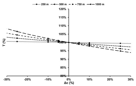 A congruent observation is found for the sensitivity of the run-time for changes in the residual value c, to which the pedal force drops when fatigue is “fully” developed and which, according to Monod and Scherrer’s critical power concept [34], may be related to an athlete’s aerobic power. After a 250 m run, this situation is not yet reached, but it is realised in longer efforts of up to 1000 m. Consequently, in Figure 13, the graph for 250 m shows a negligible impact, while at 1000 m, a linear correlation is present.