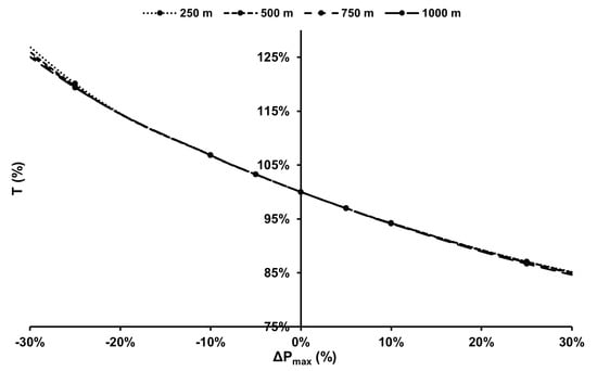 In Figure 14, the effect of maximum power attainable for the non-fatigued athlete on run-time is studied. It is important to note that all curves collapse on the same line, rendering this correlation independent from a distance. The gradient slightly decreases with increasing level of , indicating that for every step gained in maximum power by, e.g., training, an ever-smaller benefit in run-time will be achieved. This is mainly caused by the aerodynamic drag being proportional to v, the power required to maintain a given velocity increasing rapidly with v. Nevertheless, changes in show nominally the largest impact on run-time.