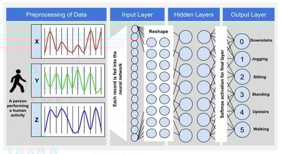 Now, we briefly describe the model development process as depicted in Figure 1. The human subject performs any one of the six activities. The accelerometer data are recorded for the three axes (x, y and z). For pre-processing this recorded data, it must be reshaped before feeding it into the neural network. During reshaping, it must be ensured that each person has multiple two-dimensional records which hold 80 time slices for each of the three accelerometer readings. Every record corresponds to a unique label. There are six unique labels, each representing the discussed human activities. Next, those records are fed into the neural network during training. Moving on to the input layer, this layer is a vector with 240 elements (flattened representation of 80-time slices for 3 accelerometer readings each). Furthermore, the three hidden layers have 100 nodes each. The layers are fully connected. There is also an additional layer for reshaping the input into an 80 × 3 matrix and a Softmax activation layer as the ending layer. Finally, coming to the output layer, the six available labels, viz., 0, 1, 2, 3, 4 and 5 can be observed in Figure 1. The network would eventually provide the probabilities regarding each output class.