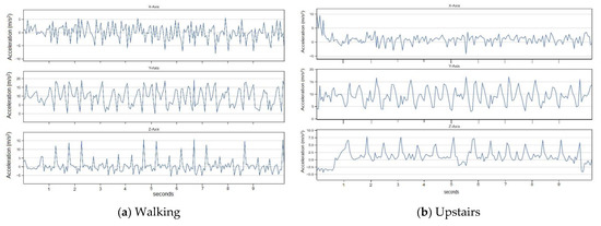 Figure 2a–f shows six plots for each activity performed by a typical human subject who had participated in the experiment. Before depicting the accelerometer values of the three axes in their graphical forms, a check for null or missing values was performed. It was found that there were no null values in the reading, thus ensuring that the data are well-filtered before representation. Every plot consists of three subplots representing acceleration values concerning the x, y, and z-axis. As mentioned before, the data are recorded at a frequency of 20 Hz, i.e., 20 samples per second. As only 180 records are considered from the beginning, each plot illustrates an interval of 9 s for the respective activities (calculation: 0.05 ∗ 180 = 9 s). It could be observed that sitting and standing activities as seen in Figure 2e,f, respectively, do not display recurring behaviour but do possess distinguishing patterns with respect to points on the x, y and z axes. In contrast, the rest of the four activities (Figure 2a–d), which involve carrying out repeated motions, do show recurring patterns in the plots. An important aspect of the plots in Figure 2 that should be noted is that the values of the y-axes have the highest magnitudes of acceleration compared with other axes. This is because of Earth’s gravity, which causes an acceleration of 9.8 m/s2 towards the centre of the earth. Due to this, the accelerometer measures 9.8 m/s2 in the direction of the Earth’s centre.
