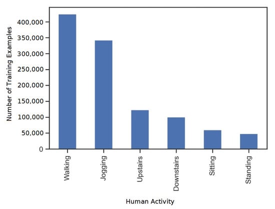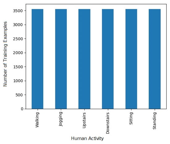 Furthermore, from Figure 4, it is obvious that user 20 has recorded the highest amount of data for the experiment. On the other hand, user 4 has recorded the least amount of data. Hence, there is non-uniformity in the recording of data by participants as well. However, this non-uniform distribution of training examples is less of a concern as we are more interested in the greater number of examples for different activities with little stress over who performs them. However, for better prediction and recognition of human activities, it is crucial to have balanced data for each of the six activities. From Figure 3, we can observe that the data are highly skewed towards walking and jogging. If this issue is avoided, it might result in overfitting during training, which could lead to an unwanted performance drop of our machine learning model [53]. Since equal importance is ought to be given for all the six activities, it is necessary to observe the activity which has the least number of examples. It is a standing activity with 3555 examples. Therefore, data are balanced by considering 3555 training examples from each of the six activities. The balanced number of training examples by activity type is shown in Figure 5.