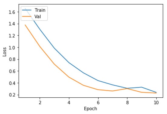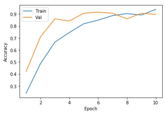 After the training is finished, it is necessary to gauge our model so that we can be sure that it can predict human activities well enough. For this purpose, two learning curves were plotted, which are presented in this paper. Figure 7 shows the plot of training and validation accuracy values for all the ten epochs. Next, Figure 8 shows the plot of training and validation loss values for all the ten epochs.